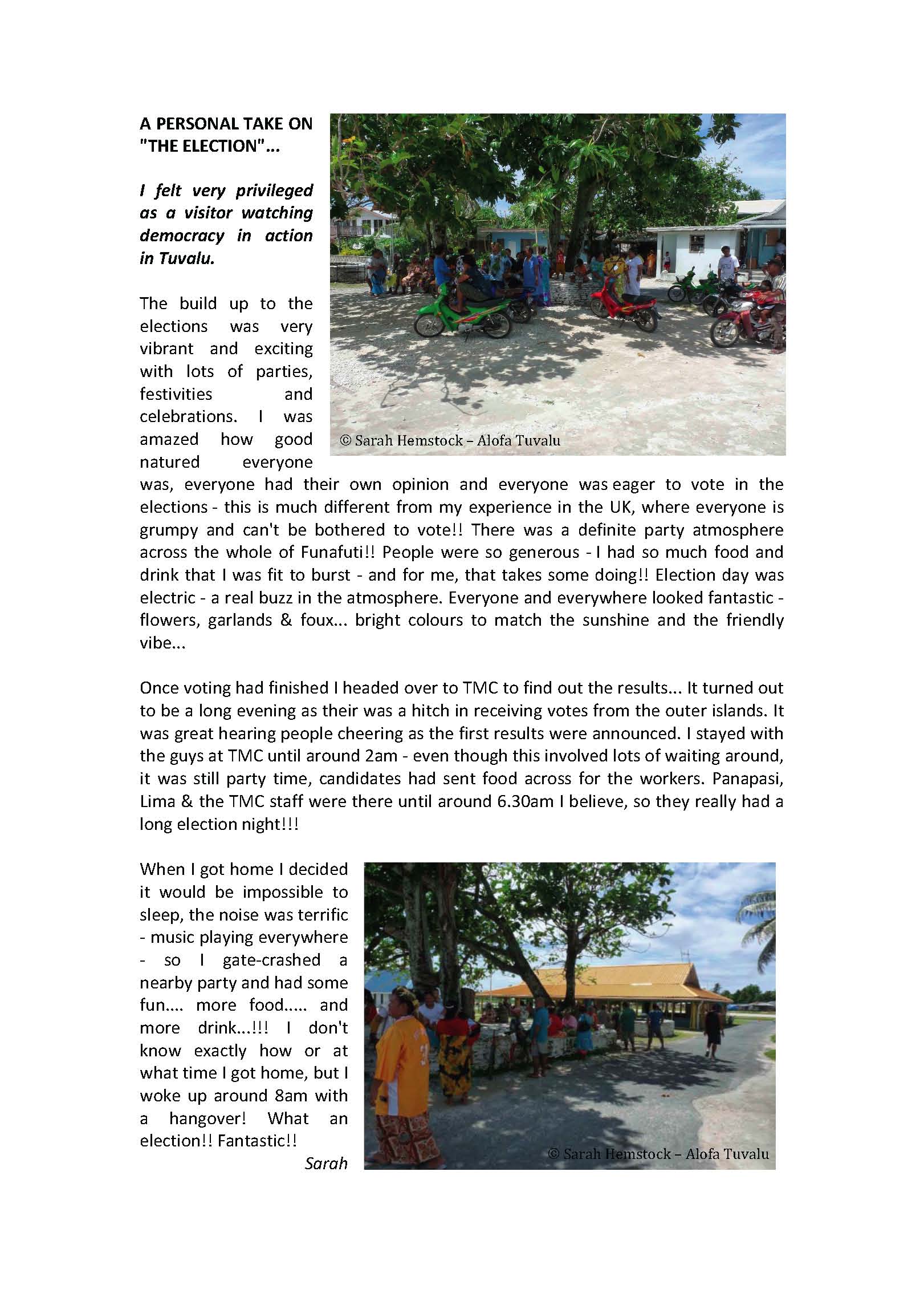 I am writing "off-line" - so unsure as to when you will receive it - because we have had no internet connection now for several days, except for a few brief periods of maybe 15 minutes every so often (the problem with the late election results is that there were no lines of communication between Funafuti & outer islands - more problems for telecom... we still have no phone connection at the house...). Even the GoT internet was down earlier this morning!!